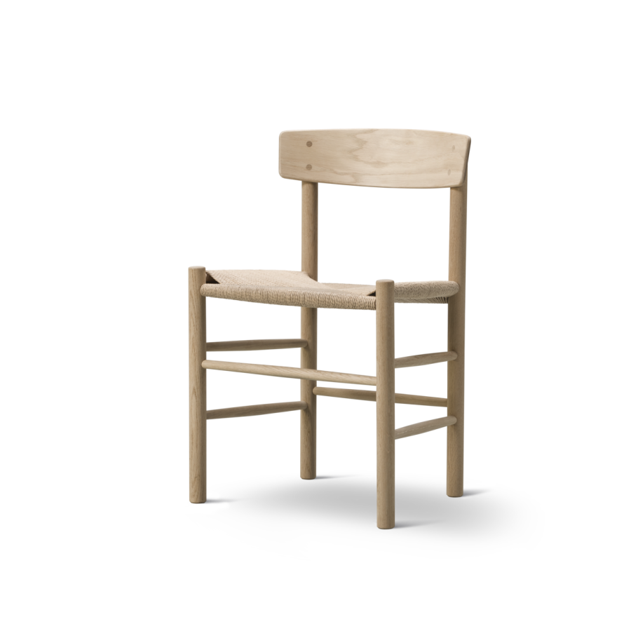 J39, Folkestolen, fås også i eg lys olie med sæde i naturflet, hvilket giver stolen et lyst og friskt udtryk. Designet af Børge Mogensen i 1947, er Folkestolen kendt for sit enkle og funktionelle design, der udstråler skandinavisk minimalisme og håndværk. Den lysolierede egramme fremhæver træets naturlige karakter og giver en blød, varm farve, der passer perfekt til både moderne og klassiske indretninger. Det naturlige flettede sæde tilføjer en organisk og behagelig tekstur, der skaber balance i designet. J39 er både robust og komfortabel, hvilket gør den ideel til spisestuer, køkkener og arbejdsområder. Med sit tidløse design er J39 et ikon i dansk møbeldesign, skabt til at holde i generationer.