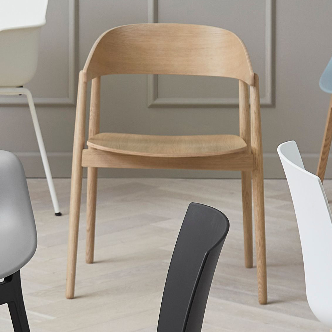 Stolens enkle, lette design og ergonomiske form sikrer komfort og støtte, hvilket gør den ideel til både spiseborde og kontormiljøer. Den fine overfladebehandling giver en glat og holdbar finish, der er nem at vedligeholde og tilpasser sig hurtigt til rummets øvrige møbler.