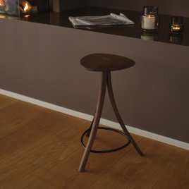 Taburettens design er minimalistisk med rene linjer og en rundet form, hvilket giver den et let og stilfuldt udtryk. De stabile ben sikrer solid støtte, og den røgede eg tilfører en naturlig dybde og elegance, der passer perfekt ind i både moderne og klassiske indretninger.