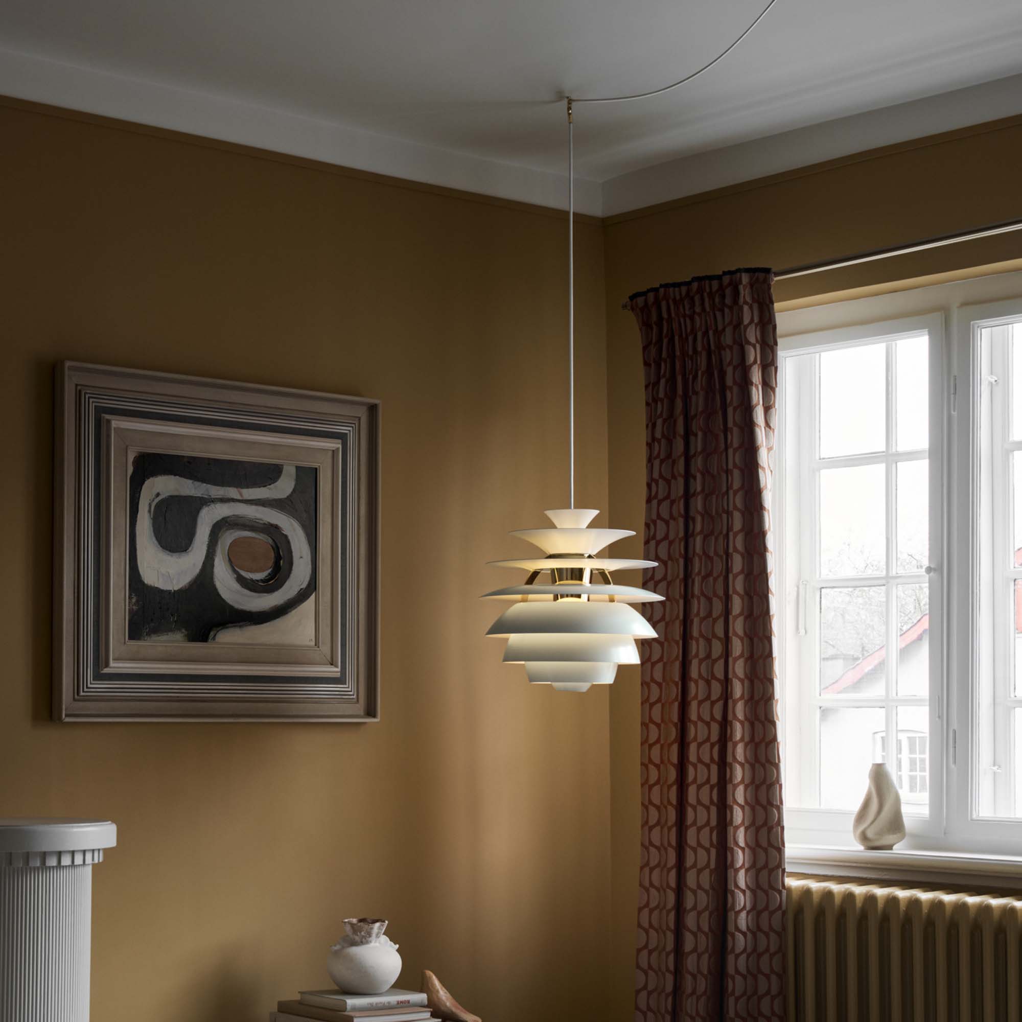 PH Snowball i den nye farve Dusty Blue med messing kombinerer Poul Henningsens tidløse design med en dyb og elegant farvepalette.
