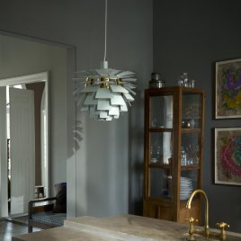 PH Artichoke i den sofistikerede farvekombination dusty green og messing er et ikonisk eksempel på dansk design og arkitektonisk belysning, skabt af Poul Henningsen i 1958 for Louis Poulsen. Lampen består af 72 præcist formede metalblade, arrangeret i 12 rækker med seks blade i hver. Denne gennemtænkte konstruktion sikrer et helt blændfrit lys, uanset hvilken vinkel pendlen betragtes fra.