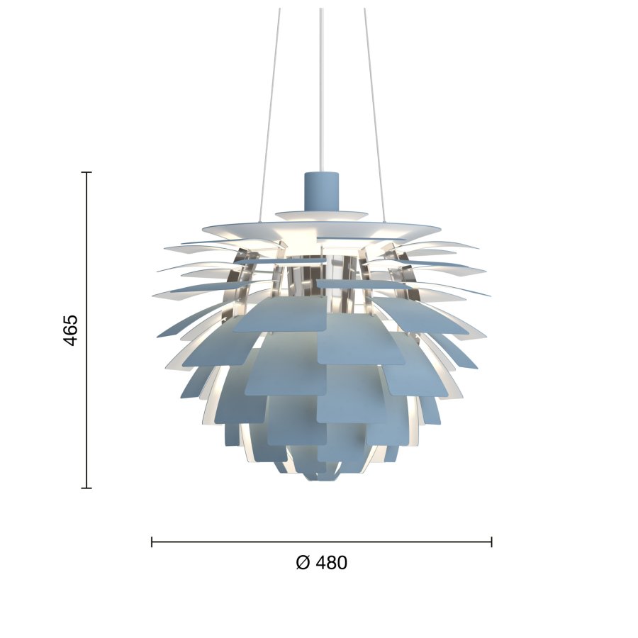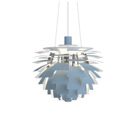 PH Artichoke i den raffinerede farvekombination dusty blue og krom er et ikonisk værk inden for dansk design, skabt af Poul Henningsen i 1958 for Louis Poulsen. Pendlen består af 72 præcist formede metalblade, arrangeret i 12 nøjagtige rækker med seks blade i hver. Denne komplekse og gennemtænkte konstruktion sikrer et helt blændfrit lys, uanset hvorfra lampen betragtes.