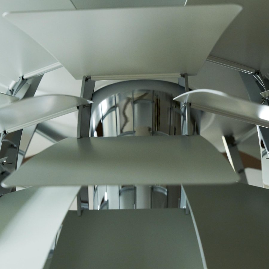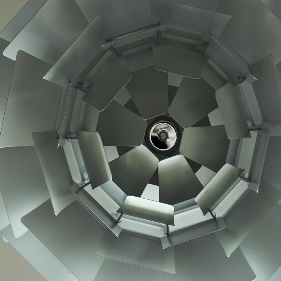 PH Kogle Ø60 i den smukke farvekombination dusty green og krom er et af de mest genkendelige værker inden for dansk design, skabt af Poul Henningsen i 1958 for Louis Poulsen. Lampen består af 72 præcist formede metalblade, fordelt på 12 rækker med seks blade i hver. Den avancerede konstruktion sikrer et helt blændfrit lys, uanset hvorfra pendlen betragtes – et kendetegn for Henningsens lysfilosofi.