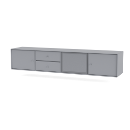 Med fire rum tilbyder møblet en kombination af funktionalitet og æstetik: en perforeret klaplåge for nem betjening af elektronik samt skuffer og døre, der giver praktisk opbevaring. Den diskrete kabelgennemføring på bagsiden sikrer en organiseret og stilren opsætning.