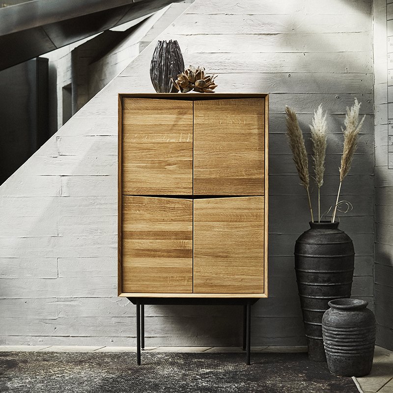 Wing højskabet er fremstillet i massivt europæisk egetræ, et robust og holdbart materiale, der giver møblet både karakter og lang levetid. Bag hver låge finder du en justerbar hylde, så du nemt kan tilpasse opbevaringspladsen efter dine behov.