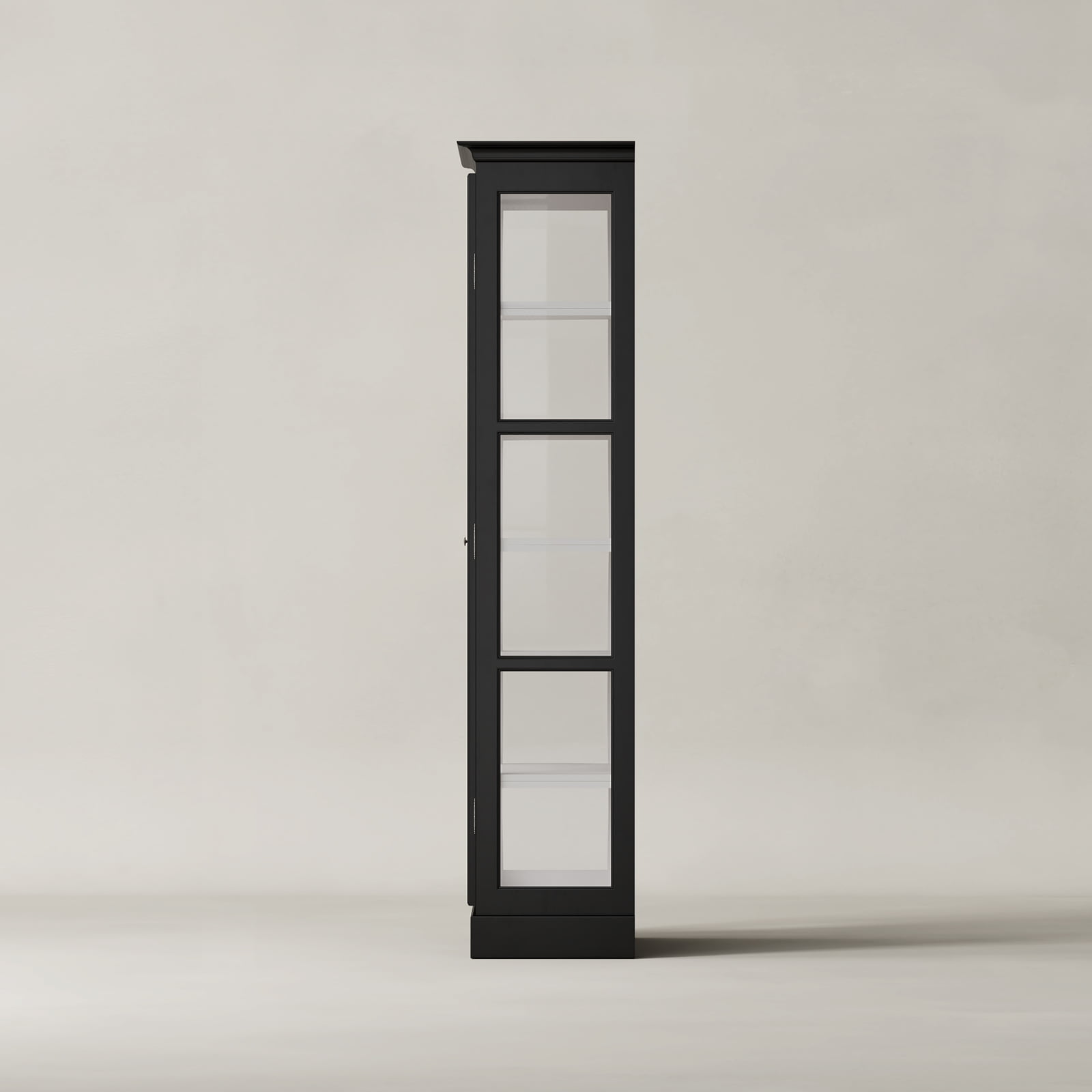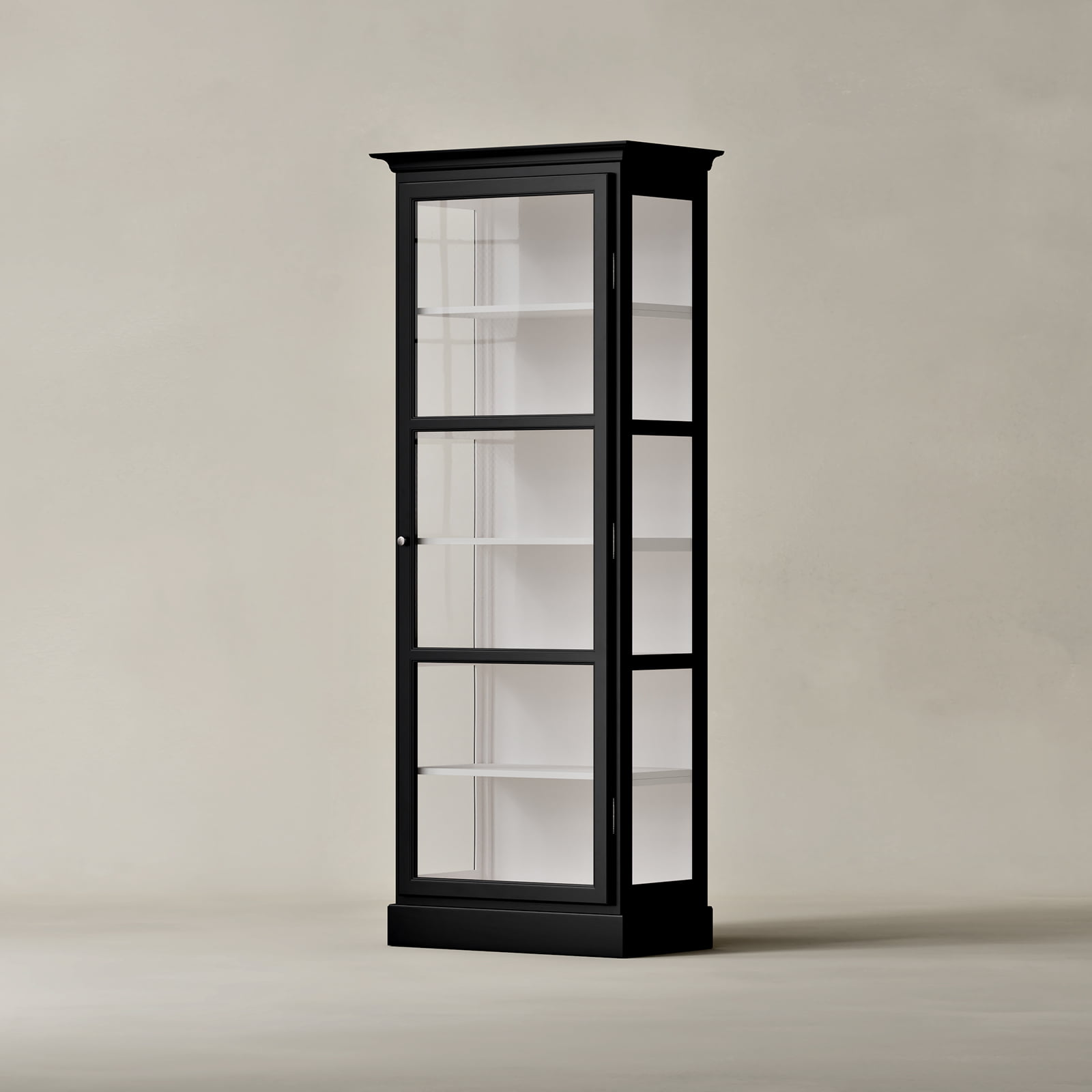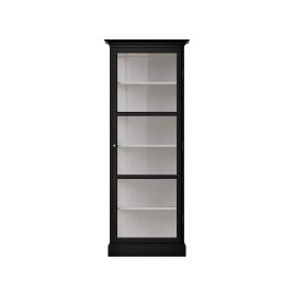 Elegant og enkelt vitrineskab udført i malet fyrretræ med glas i siderne. De fine, sofistikerede detaljer giver skabet et raffineret og harmonisk udtryk. Hængsler og greb i råt jern tilfører et diskret industrielt præg, mens den profilerede top refererer til klassiske, nordiske designtraditioner. Resultatet er et tidløst vitrineskab, der smukt forener tradition og modernitet og passer perfekt ind i den moderne bolig.