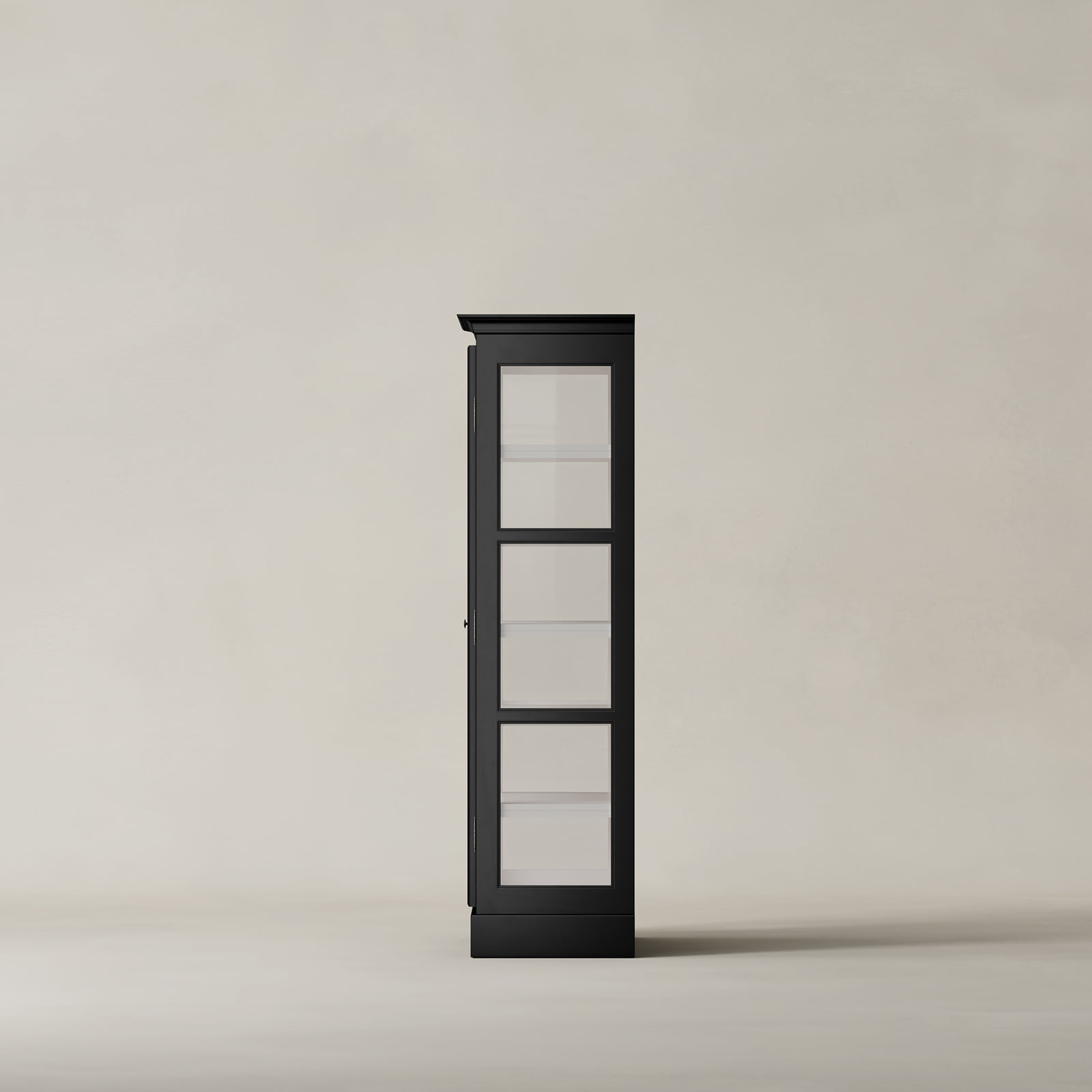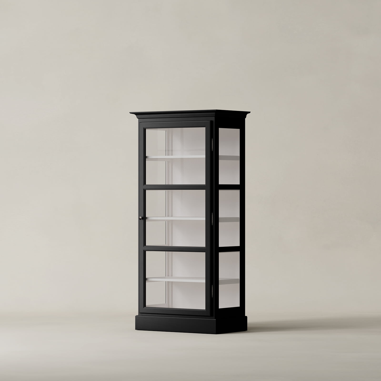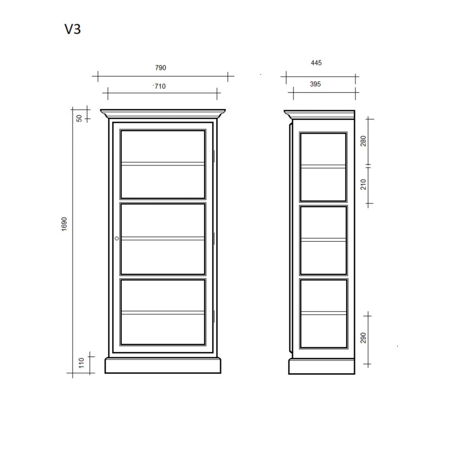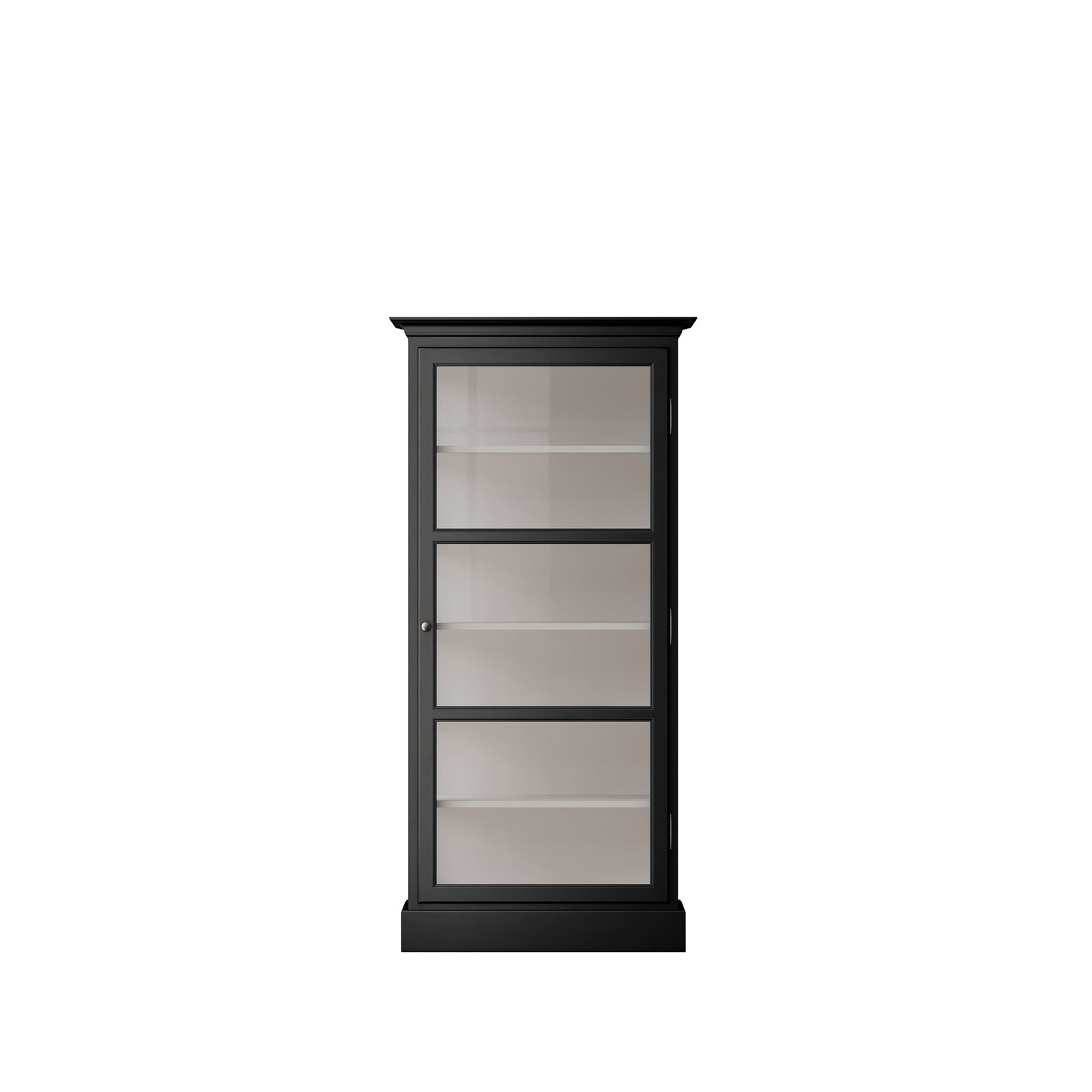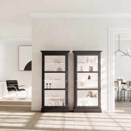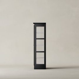 Elegant og lavt vitrineskab udført i malet fyrretræ med glas på alle sider, der giver et let og åbent udtryk. Hængsler og greb i ædelt metal tilføjer et raffineret og eksklusivt præg, mens den klassisk udformede top trækker reference til skandinavisk designtradition. Et tidløst og alsidigt møbel, der passer perfekt i mindre rum – ideelt til sommerhuset eller til at fremvise børnenes yndlingslegetøj på værelset.