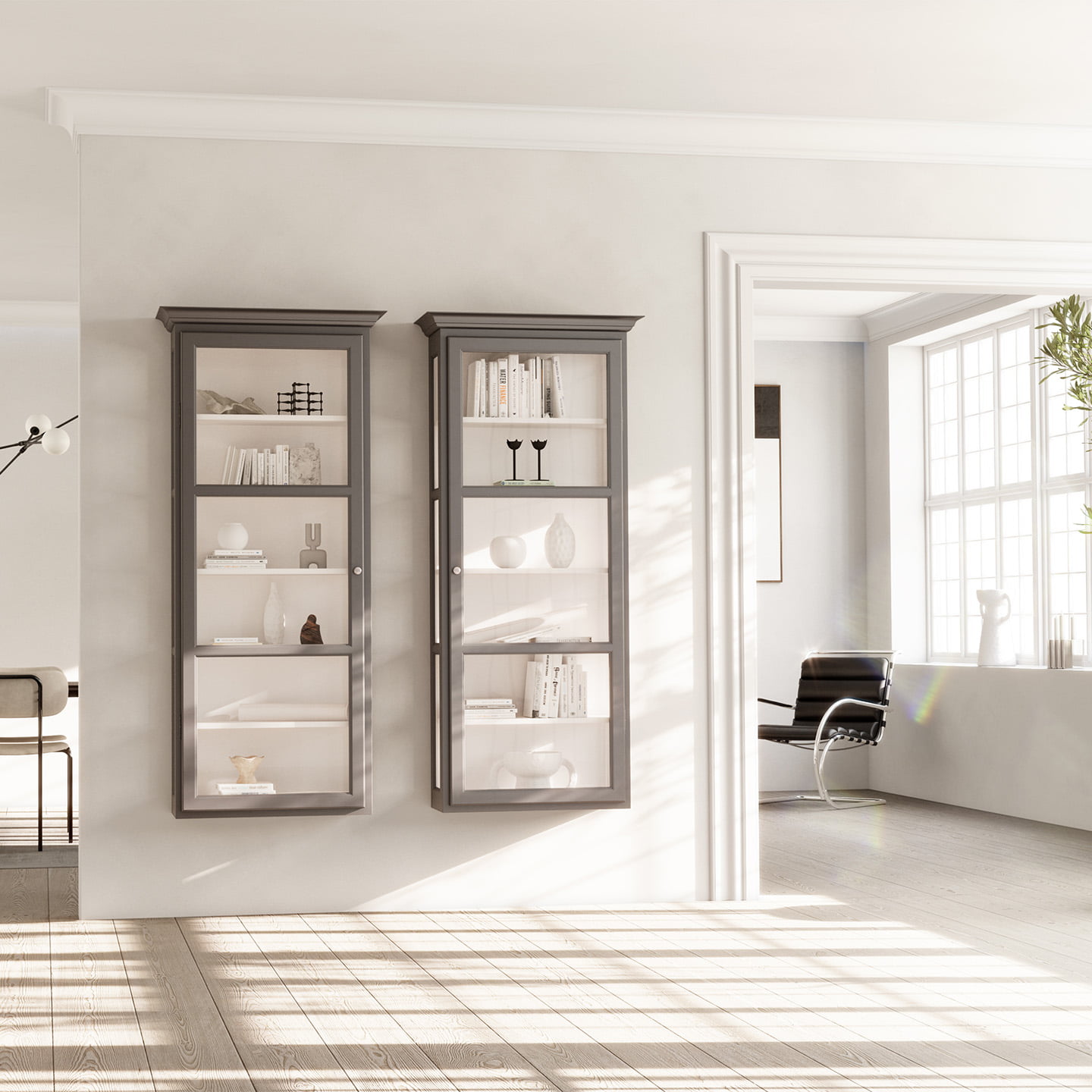 Væghængt vitrineskab i malet fyrretræ med glas i siderne, der skaber et let og elegant udtryk. De fine detaljer understreger skabets sofistikerede design, mens hængsler og greb i råt jern tilfører et subtilt, rustikt præg. Den klassisk profilerede top refererer til traditionelle nordiske designtræk og giver vitrineskabet et tidløst og harmonisk udseende. Et elegant valg, der passer smukt ind i den moderne bolig.