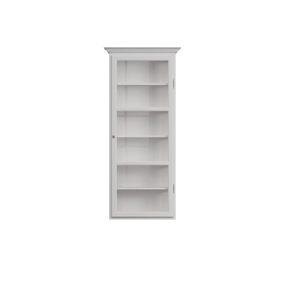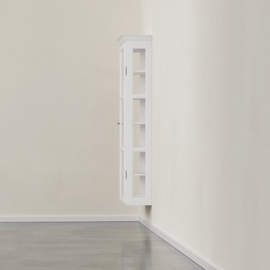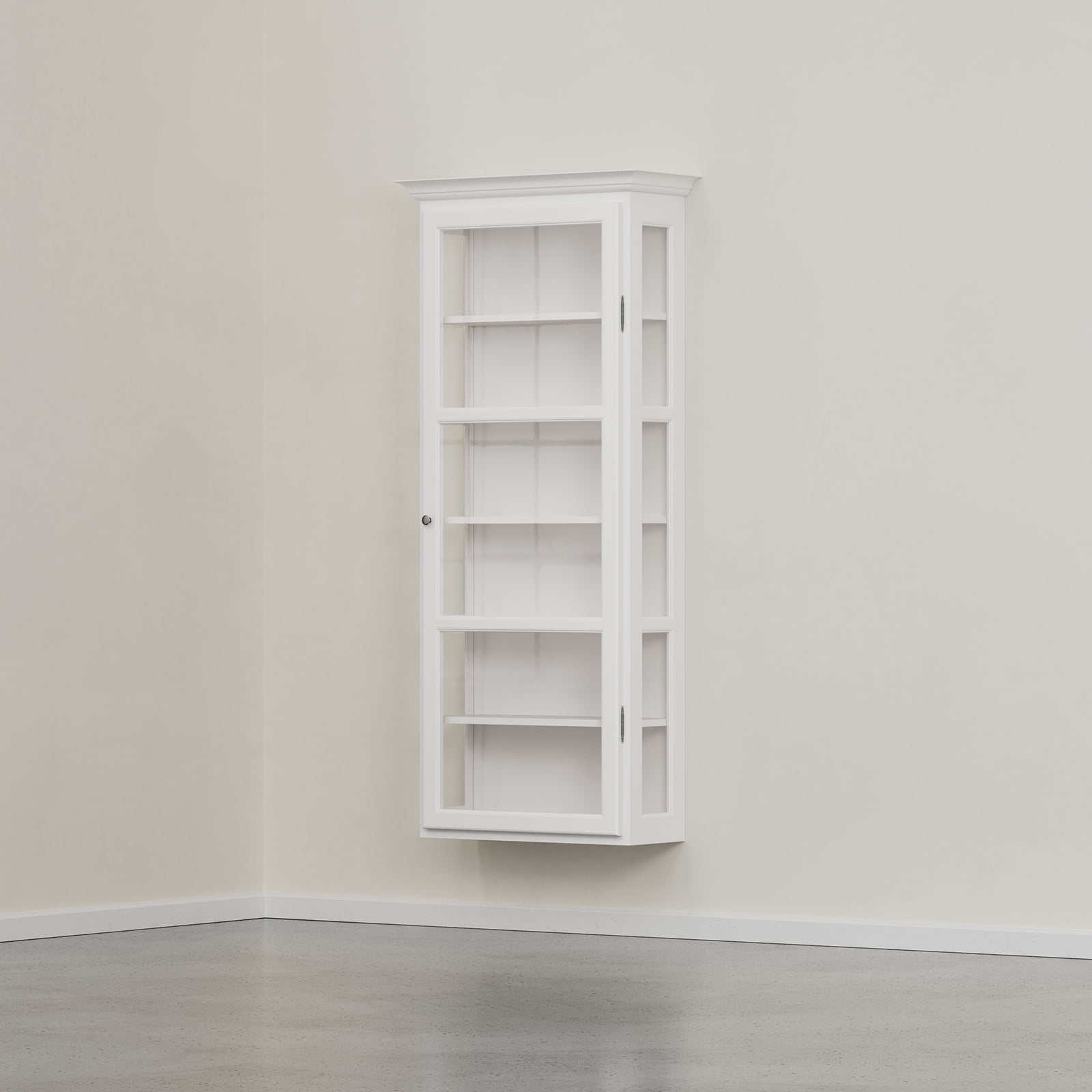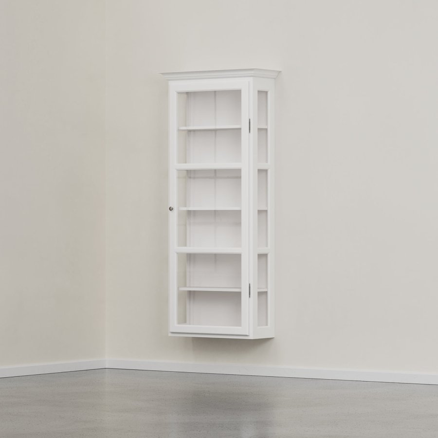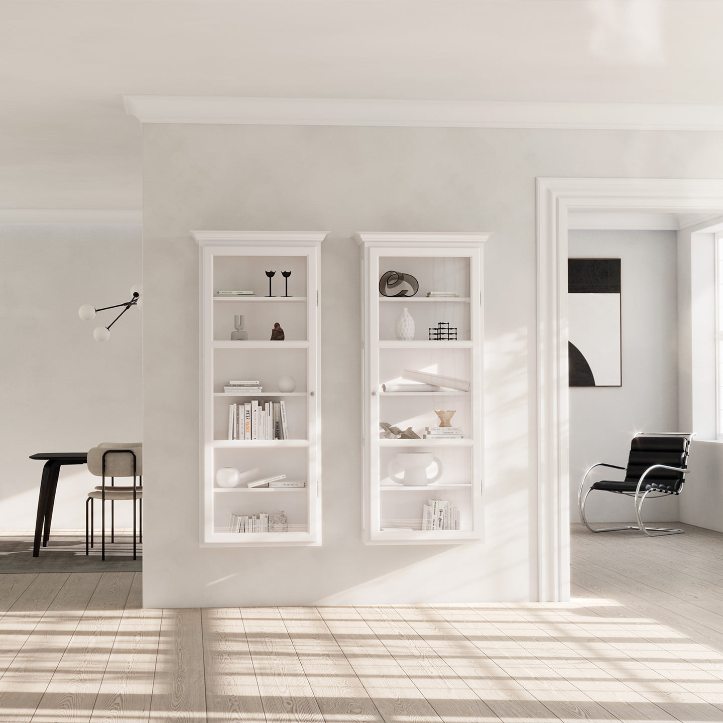 Væghængt vitrineskab i malet fyrretræ med glas i siderne, der skaber et let og elegant udtryk. De fine detaljer understreger skabets sofistikerede design, mens hængsler og greb i råt jern tilfører et subtilt, rustikt præg. Den klassisk profilerede top refererer til traditionelle nordiske designtræk og giver vitrineskabet et tidløst og harmonisk udseende. Et elegant valg, der passer smukt ind i den moderne bolig.