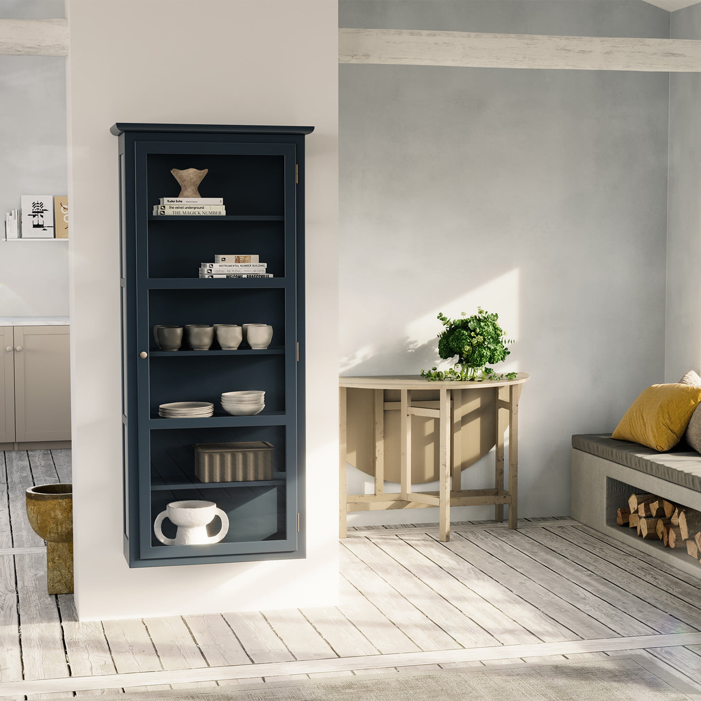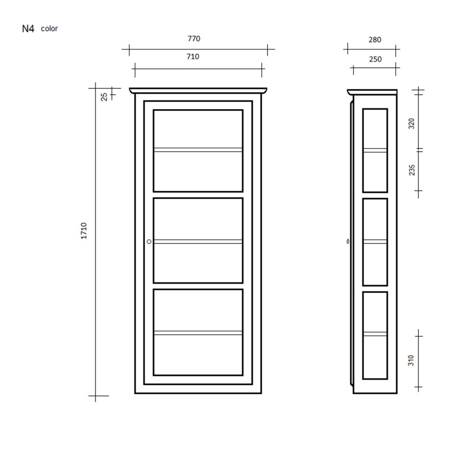 Det væghængte Color N4 vitrineskab er udført i en afbalanceret farvetone, der fremhæver skabets enkle og elegante formsprog. Kombinationen af den nøje udvalgte farve og de rene linjer gør vitrinen ideel til den skandinaviske indretningsstil, hvor farver og kontraster skaber liv og personlighed. Skabet er fremstillet i massivt fyrretræ og udstyret med hængsler og greb i messing, som tilfører et varmt og eksklusivt udtryk.