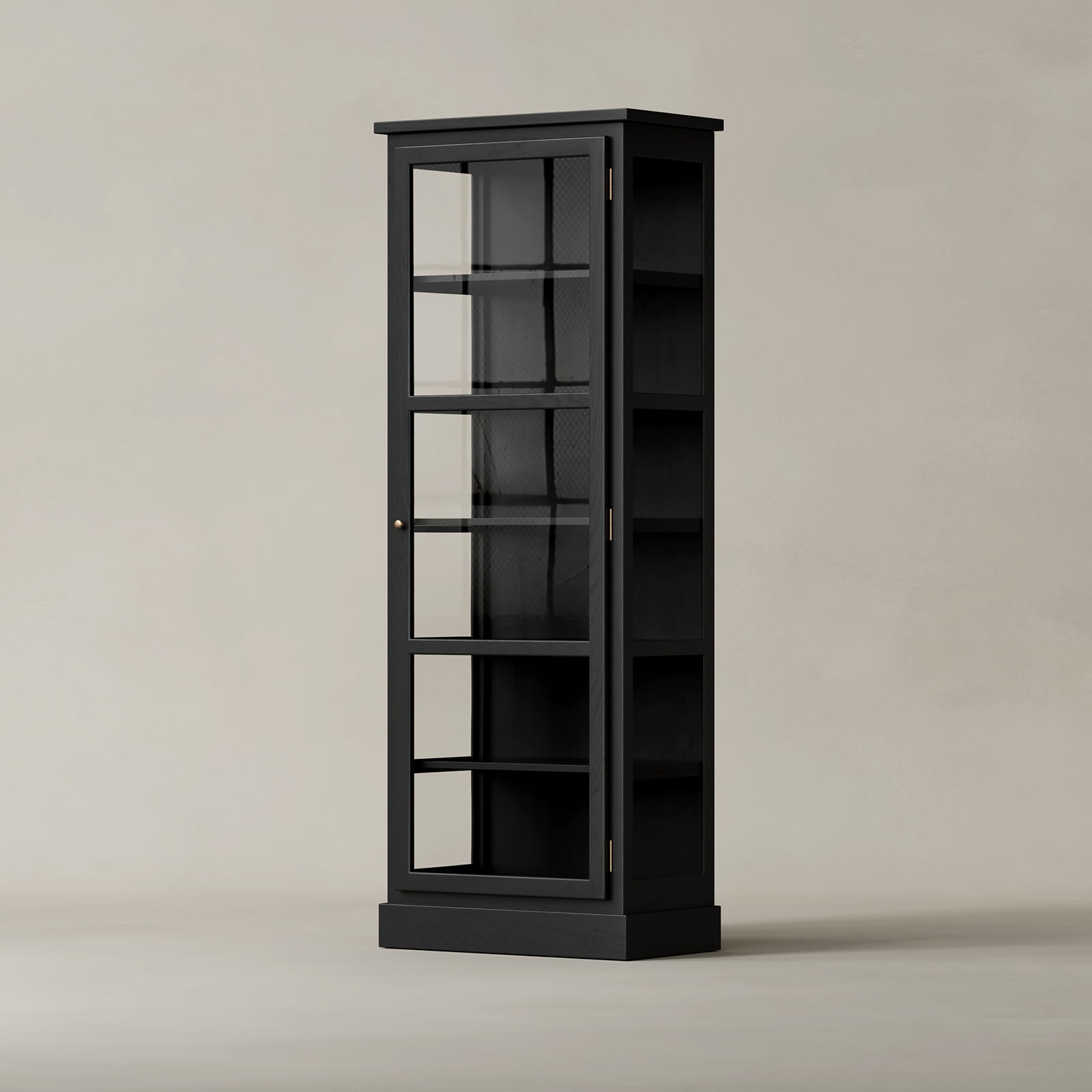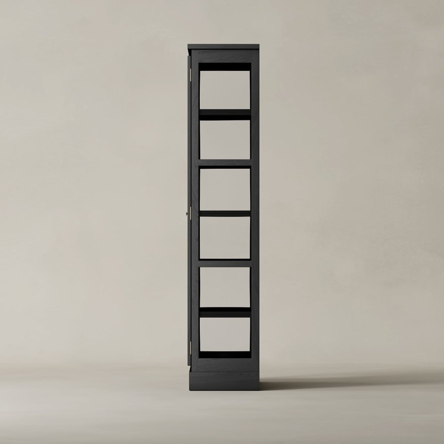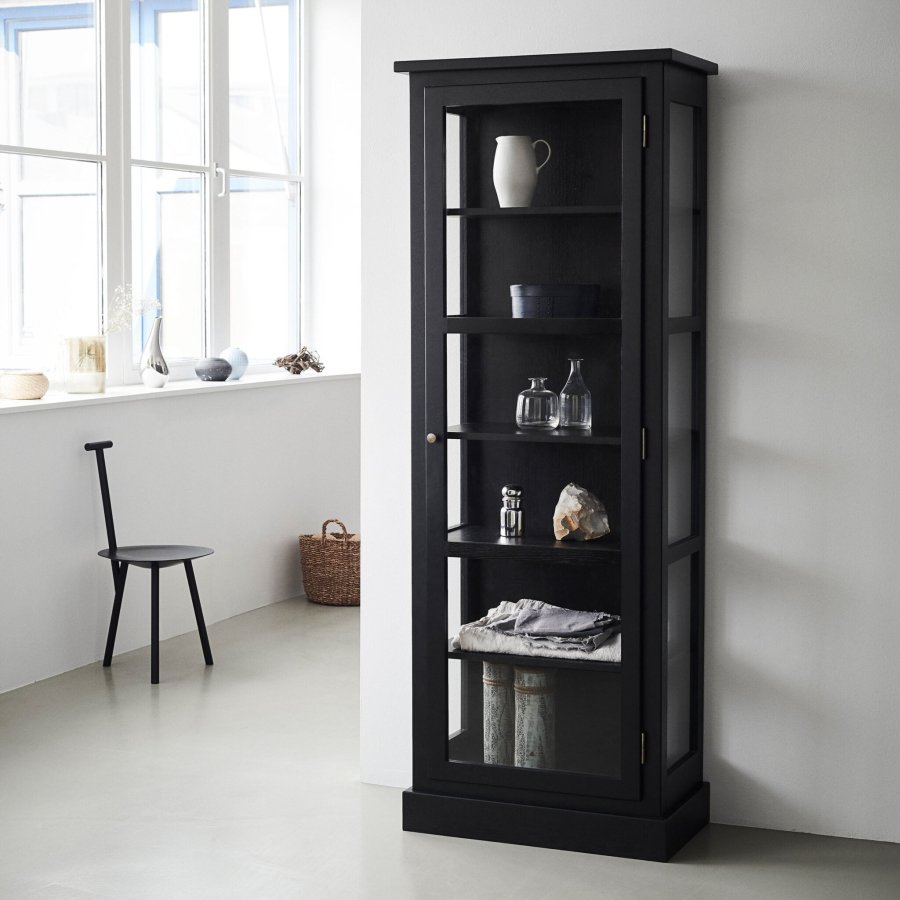 Vores Dark Oak N1 vitrineskab er en eksklusiv specialudgave af N-serien, fremstillet i eg og bejdset i en dyb sortbrun tone. Den fine overfladebehandling fremhæver træets naturlige struktur og giver skabet en varm og sanselig karakter. N1 Dark Oak er designet med en forenklet topprofil, der understreger det rene formsprog, mens hængsler og greb i messing tilfører et elegant og sofistikeret præg.