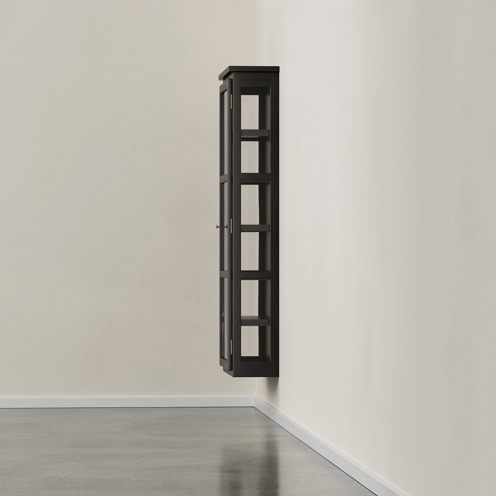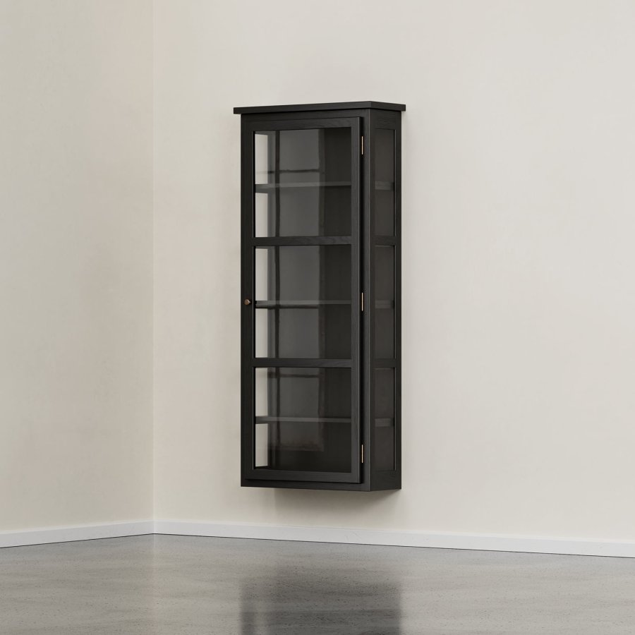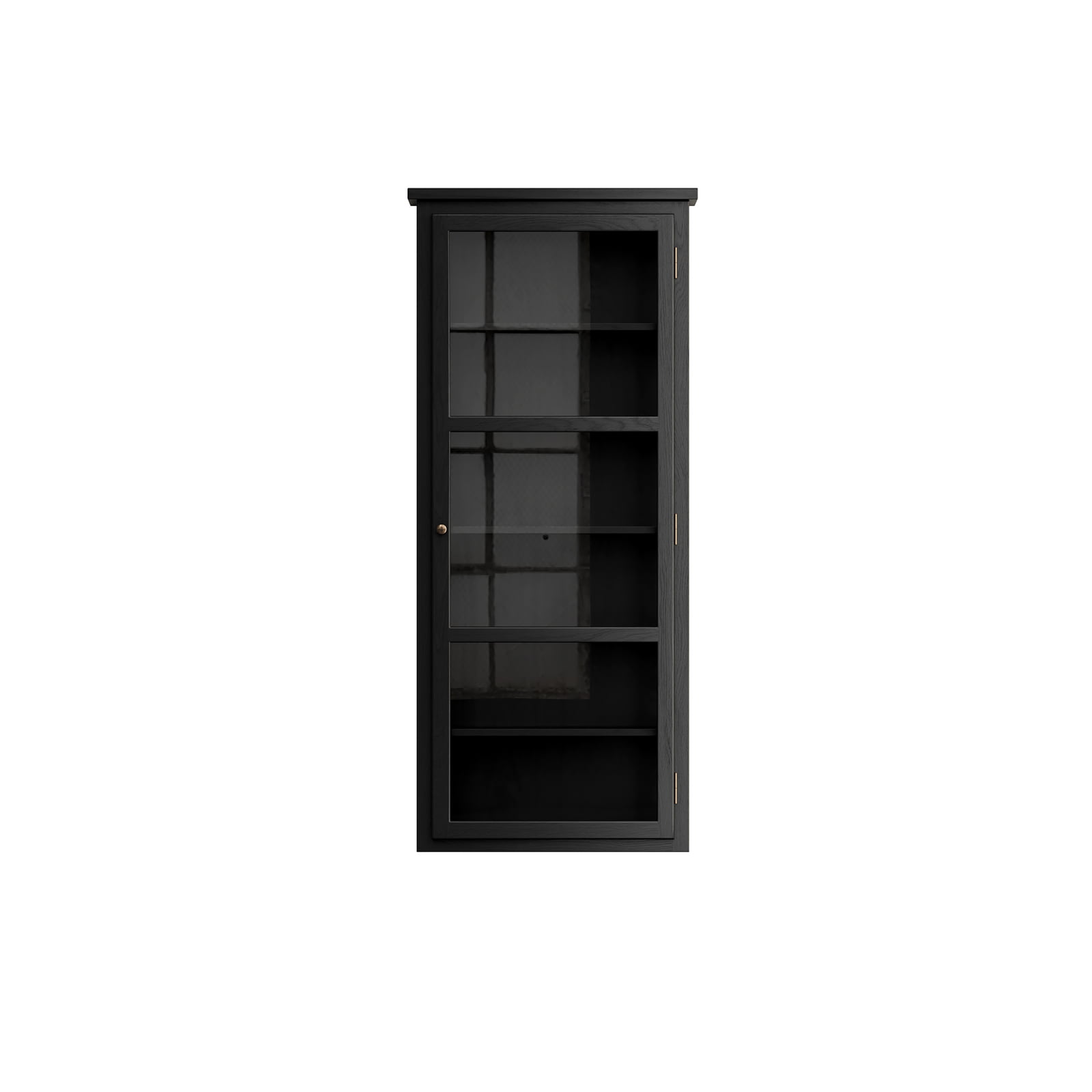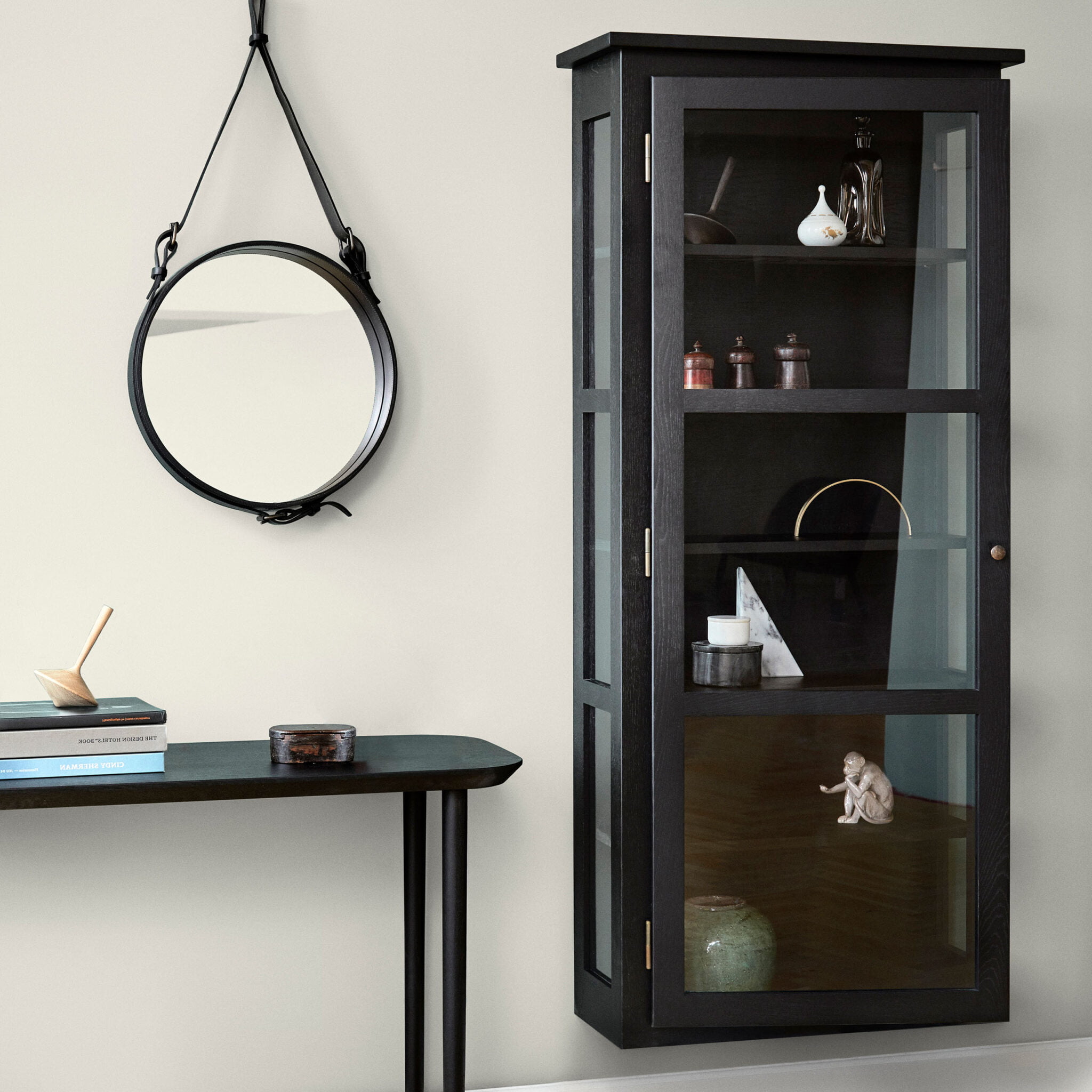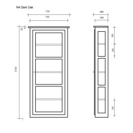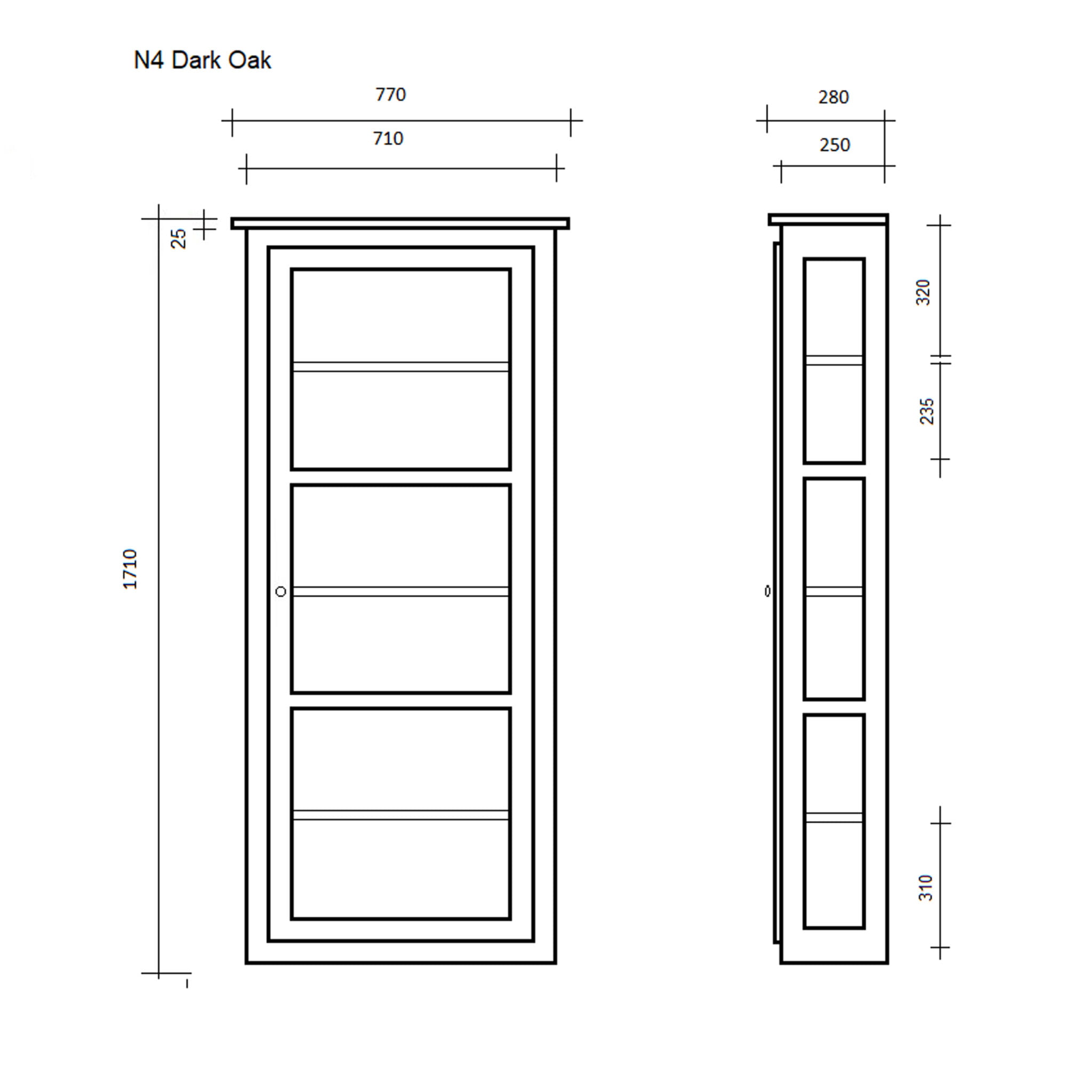 Dark Oak er en eksklusiv specialudgave af N-serien, fremstillet i eg og bejdset i en dyb sortbrun tone. Den mørke overflade fremhæver træets naturlige struktur og tilfører vitrinen en varm og levende tekstur. N4 Dark Oak er designet med en forenklet topprofil, der understreger det enkle formsprog, mens hængsler og greb i messing giver et elegant og sofistikeret udtryk.