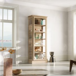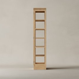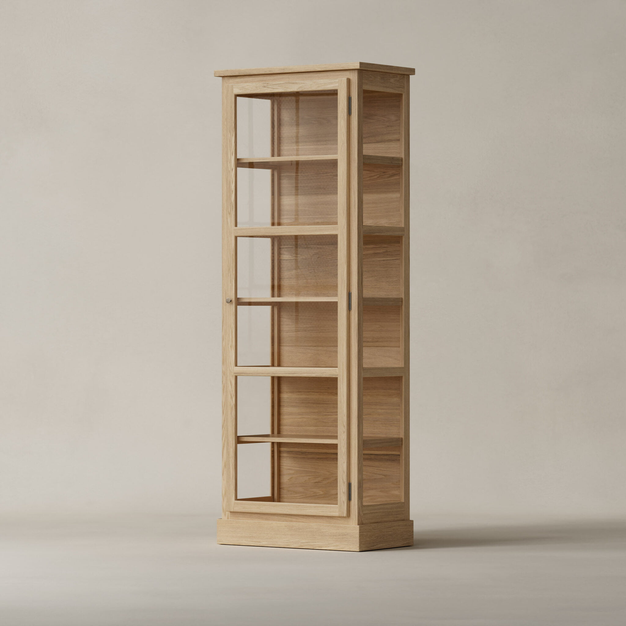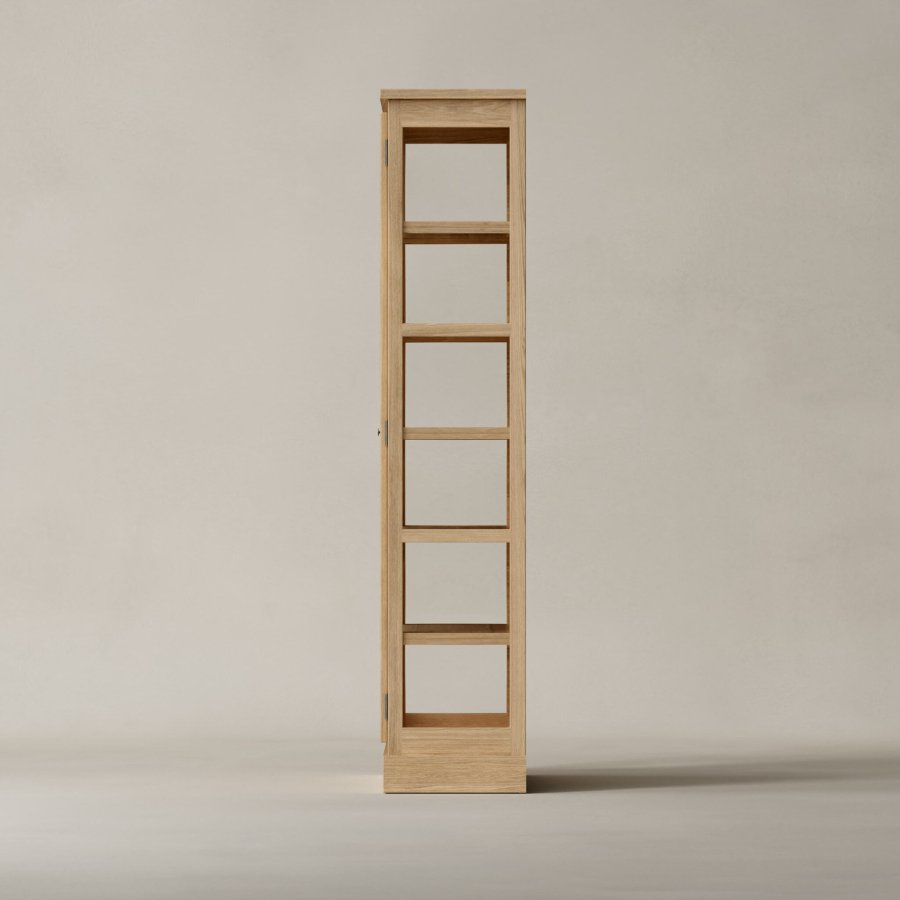 N1 Light Oak er et enkeltlåget vitrineskab udført i lyst, massivt egetræ med en matlakeret overflade. Den naturlige finish fremhæver egetræets fine struktur og giver skabet en varm og levende tekstur. Designet er kendetegnet ved en forenklet topprofil, der understreger det rene og moderne udtryk, mens hængsler og greb i messing tilfører et elegant og tidløst præg.