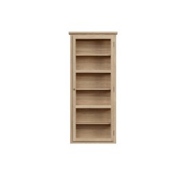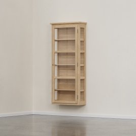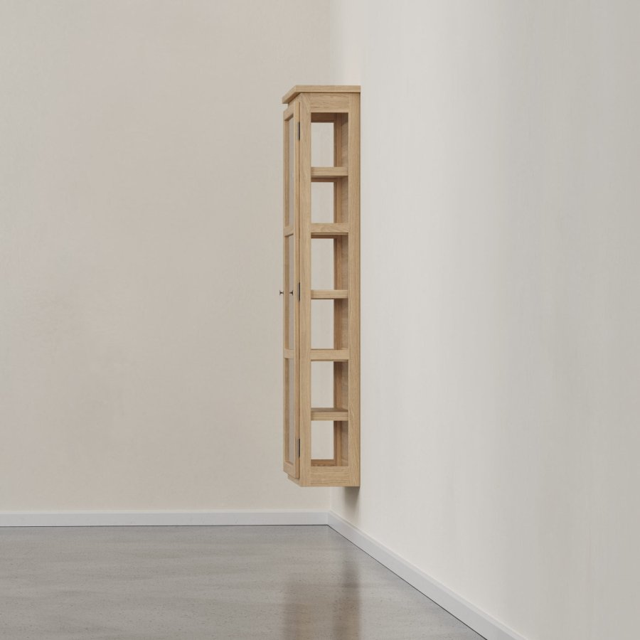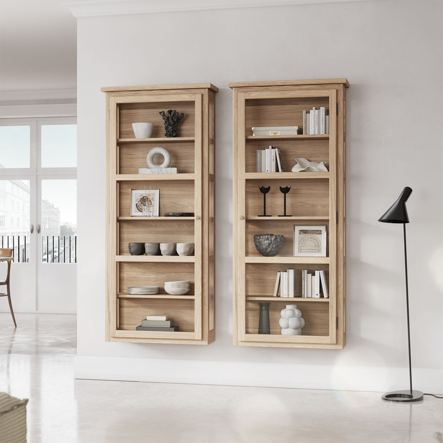 N4 Light Oak er et væghængt vitrineskab udført i lyst, massivt egetræ med en matlakeret overflade. Den delikate behandling fremhæver træets naturlige struktur og giver vitrinen en varm og indbydende karakter. Designet er præget af en forenklet topprofil, der understreger det elegante og minimalistiske formsprog, mens hængsler og greb i messing tilfører et eksklusivt og tidløst udtryk.