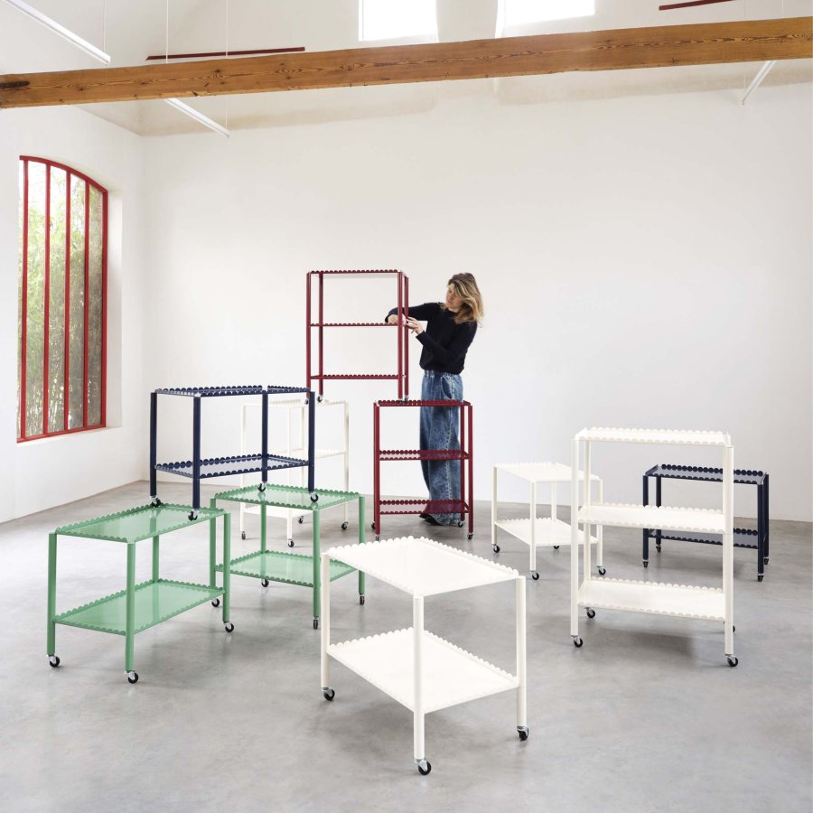 Arcs Trolley Lav i Steel Blue er designet af Muller Van Severen og produceret af HAY. Denne stilfulde trolley kombinerer minimalistisk design med praktisk funktionalitet og har to hylder, der giver rigelig opbevaringsplads til små genstande, bøger eller dekorationer.