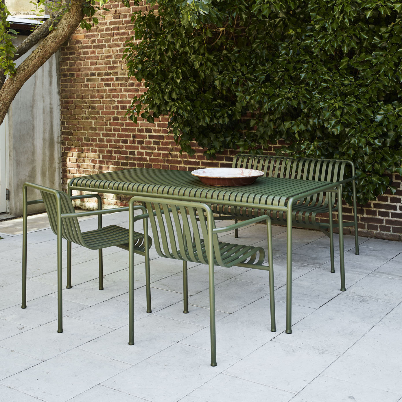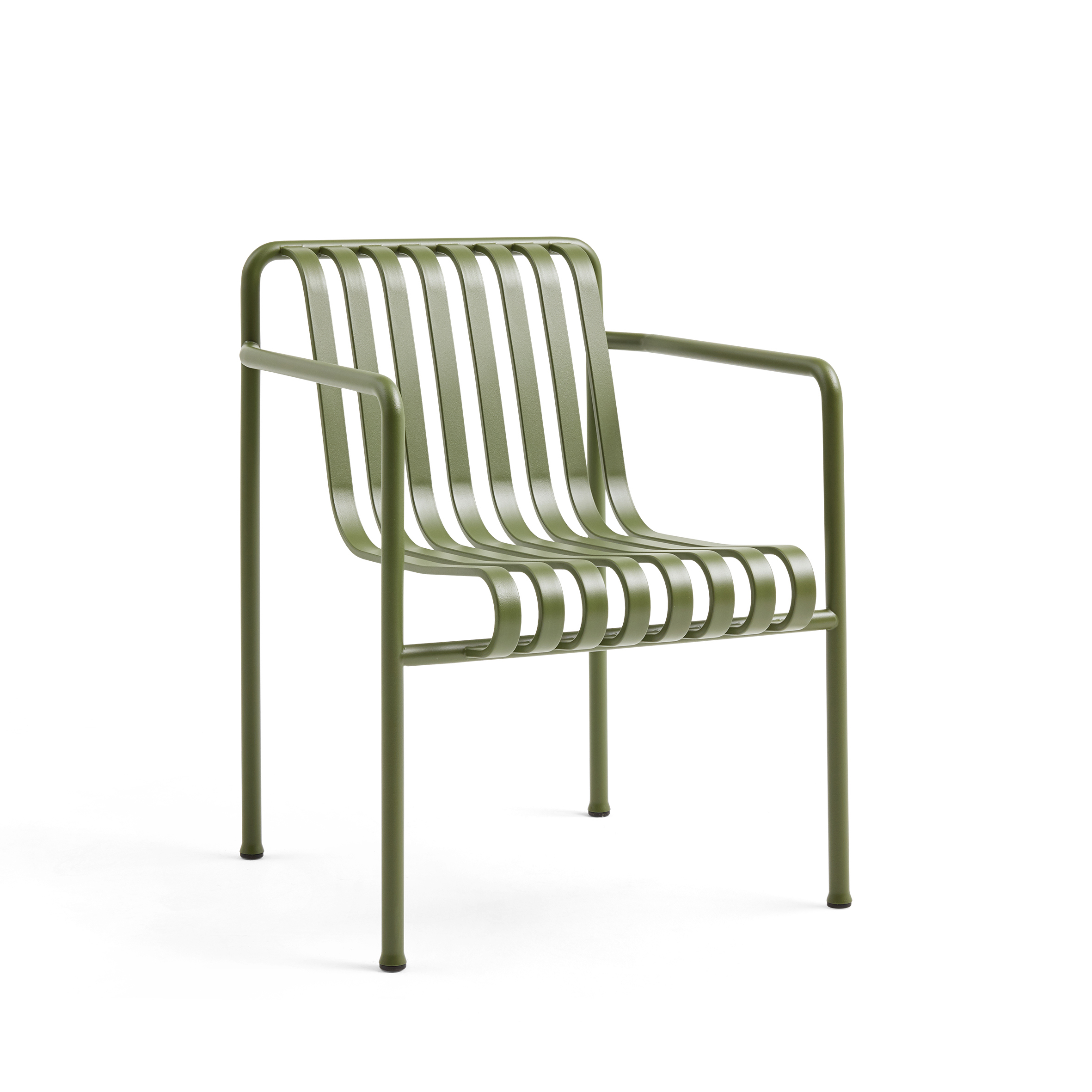 Palissade Dining Armstolen i Olive er en del af den elegante og funktionelle udendørsmøbelkollektion designet af de franske brødre Ronan og Erwan Bouroullec. Stolen er fremstillet i pulverlakeret stål, hvilket gør den både robust og modstandsdygtig overfor vejrfaktorer, samtidig med at den opretholder et let og stilfuldt design, ideelt til udendørsbrug.