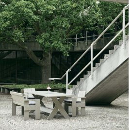 Crate Bordet, designet af Gerrit Rietveld i 1934 og produceret af HAY, er et funktionelt og skulpturelt udendørs spisebord med et markant arkitektonisk udtryk. Bordet er fremstillet af massivt fyrretræ og har en enkel, men robust konstruktion, der afspejler Rietvelds karakteristiske designfilosofi med rene linjer og præcise proportioner.