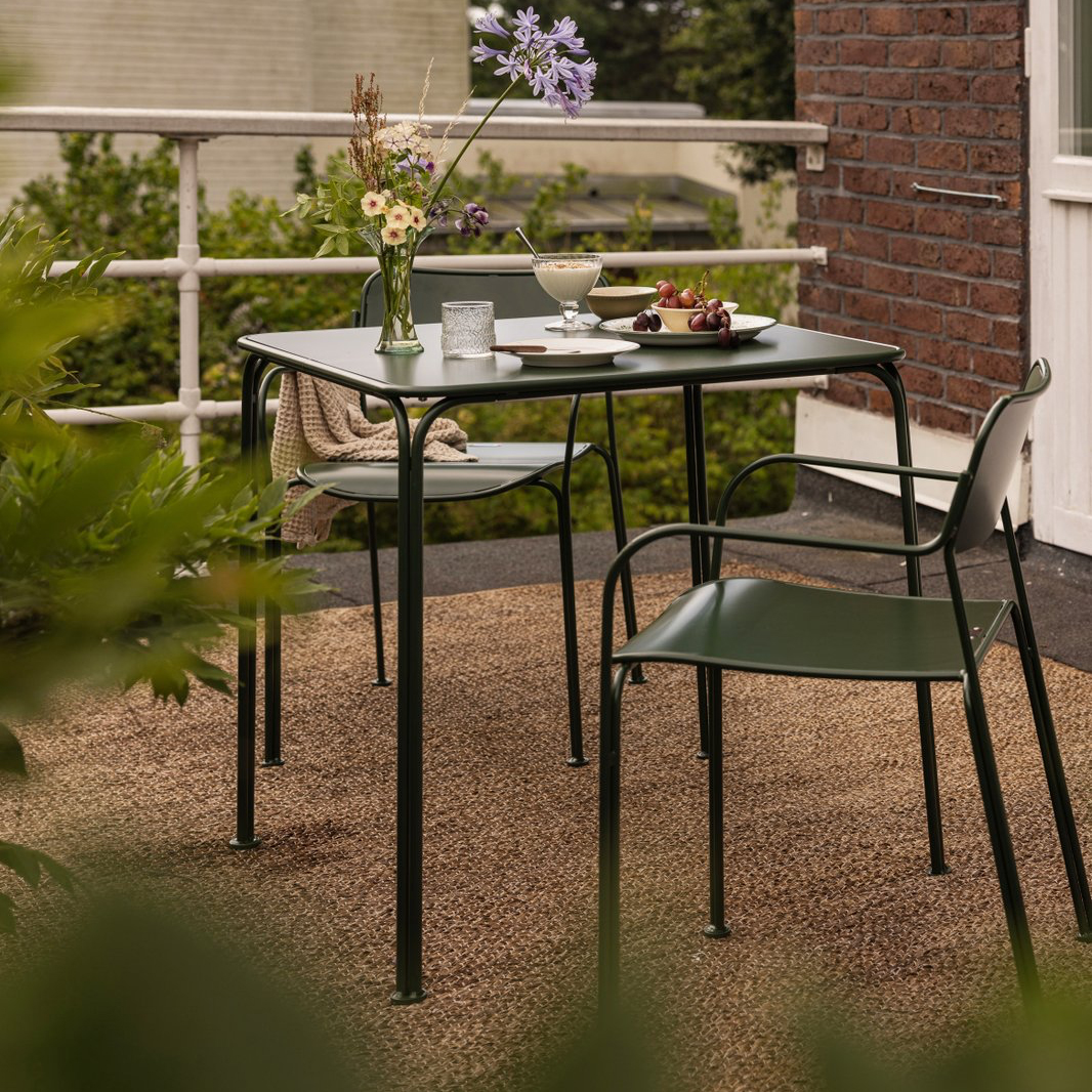 Bordet er svejset i ét stykke af massivt stål og derefter elektrogalvaniseret og pulverlakeret i en dyb grøn nuance (RAL 6020 Chrome Green). Den slidstærke overflade gør det ideelt til udendørs brug, og det stramme formsprog passer ind i både private haver og offentlige rum.