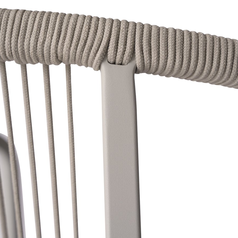 Den lave Open-Air loungestol har en stilren pulverlakeret aluminiumsramme, hvor det afrundede ryglæn smelter harmonisk sammen med de brede armlæn. De flettede snore omkring ryglænet og armlænene understreger stolens lette og luftige design, der definerer Open-Air-kollektionen.