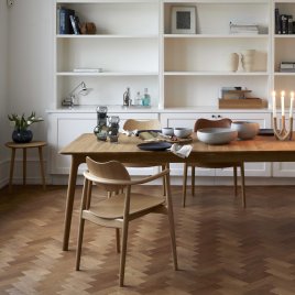 Salon Udtræksbord 100x220 fra Ro Collection er et stilfuldt og funktionelt spisebord, der kombinerer tidløst design med praktisk fleksibilitet. Bordet er fremstillet i massivt egetræ og behandlet med en sæbebehandlet overflade, som fremhæver træets lyse nuancer og fine åretegninger, hvilket giver bordet et naturligt og blødt udtryk. Med sine oprindelige mål på 100x220 cm og muligheden for udtræk, tilbyder bordet ekstra plads, hvilket gør det ideelt til både hverdagsbrug og festlige sammenkomster.