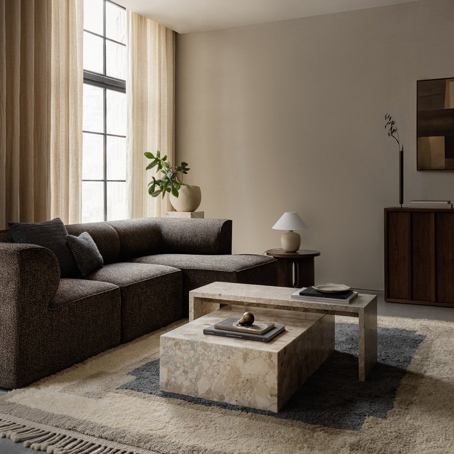 Plinth Low fra Audo Copenhagen fås også i Sand Kunis Breccia-marmor, en eksklusiv marmortype med varme beige og sandfarvede toner, der skaber en blød og naturlig æstetik. De subtile årer og naturlige variationer i stenen gør hvert bord unikt og tilføjer en organisk elegance til designet.